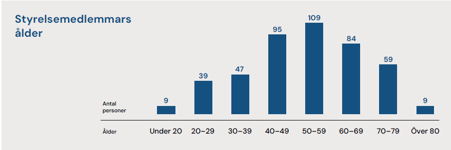 Kartläggningen visar att den genomsnittliga styrelsemedlemmen är 52 år och har haft sitt uppdrag i drygt sex år. Åldersmässigt är en klar majoritet av styrelsemedlemmarna mellan 40 och 69 år. De utgör 288 personer av de totalt 451 styrelsemedlemmar.
